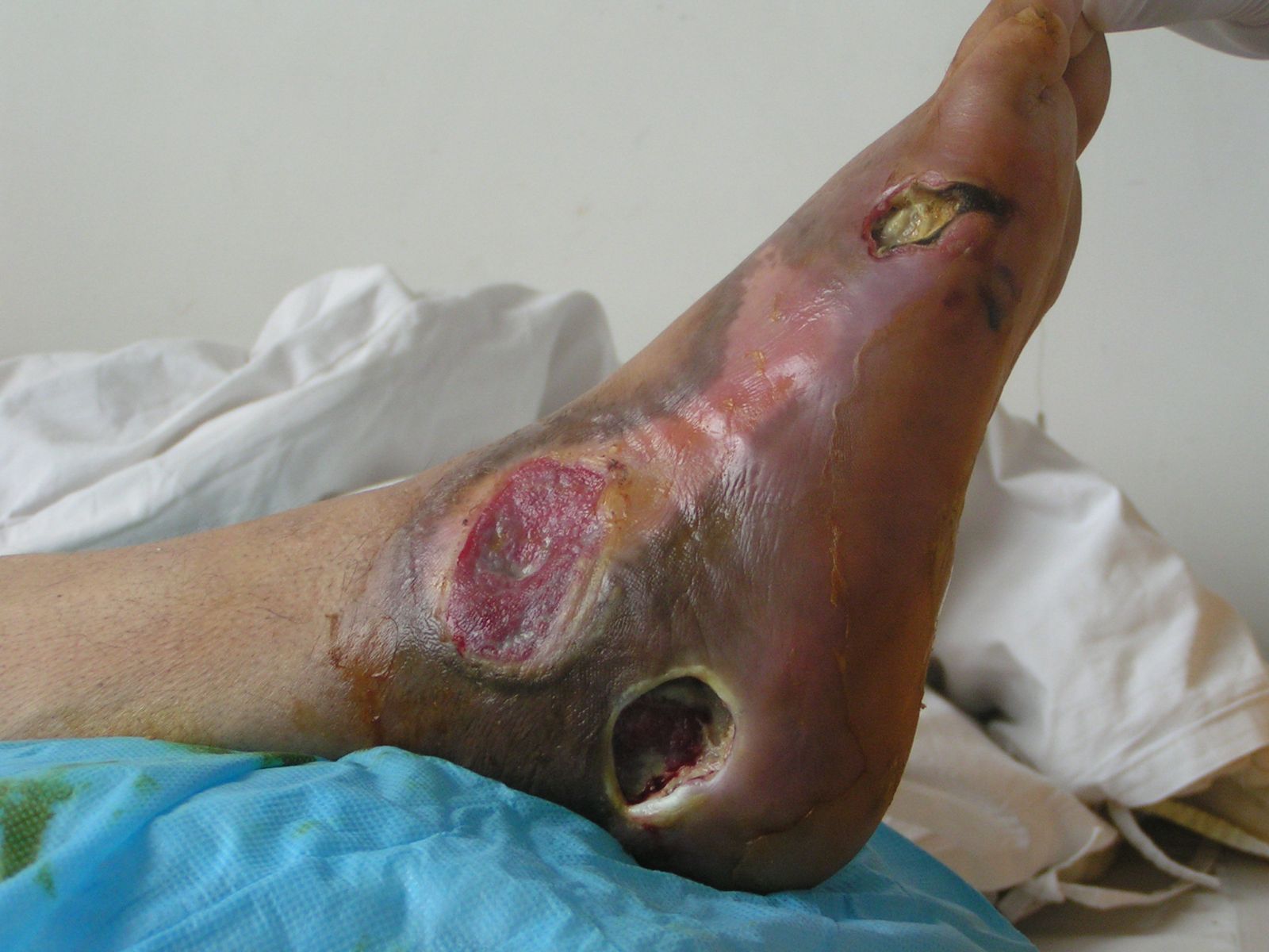 5级:坏疽影响到整个足。大动脉阻塞起了主要的病因学作用,神经病变和感染也影响。