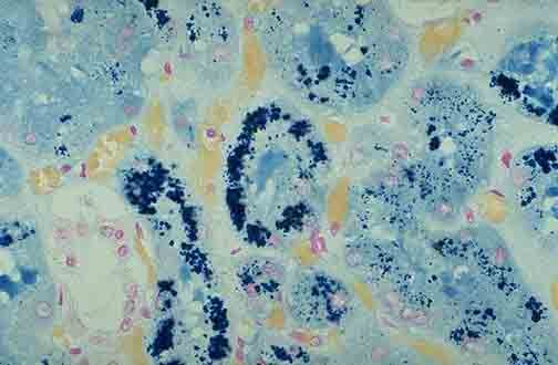 2.光学显微镜检查 肺泡上皮细胞肿胀、变性、脱落和增生,肺泡腔内可见含有红细胞或含铁血黄素的吞噬细胞,肺泡壁弹性纤维变性,毛细血管增生,基底膜增厚,肺内小动脉弹性纤维变性,含铁血黄素沉着,内膜纤维化、玻璃样变。淋巴管周围有淋巴细胞、浆细胞和含铁血黄素巨噬细胞浸润,淋巴管扩张。疾病后期可导致弥漫性肺纤维化,肺气肿,支气管扩张等。