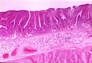 1.小肠病变 病变多见于十二指肠及空肠,而远端小肠较少,胃和结肠很少波及。病变肠壁水肿、增厚,小肠绒毛变粗、变短或完全消失,极少有溃疡。黏膜下各层皆可见黄色脂质沉积,淋巴管有阻塞及扩张,组织学特征性变化是小肠黏膜PAS阳性巨噬细胞和黏膜下淋巴管扩张。黏膜固有层因大量泡沫巨噬细胞浸润,致绒毛增粗变形。Black Schaffe首先证实这种特有的泡沫巨噬细胞内含有一种PAS浓染的糖蛋白。由于这些巨噬细胞移位,患者黏膜固有层中浆细胞、淋巴细胞和嗜酸性细胞减少。
