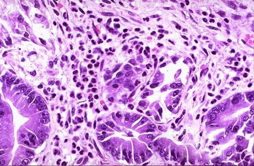 典型的组织学表现为黏膜下层慢性炎性细胞浸润和肉芽组织形成。于广泛存在的溃疡之间可见散在存活的黏膜岛,在黏膜脱落部位的黏膜床可见到肉芽组织和炎性细胞,有时在黏膜下动脉中可见到小动脉炎和纤维蛋白栓子。在上皮再生的部位可见到毛细血管增生、成纤维细胞和巨噬细胞。肉芽组织周围可有嗜酸性粒细胞和含血红蛋白铁的组织细胞浸润,这些含血红蛋白铁的巨噬细胞的存在提示以前有出血性肠梗死的发生,可用于与溃疡性结肠炎和克罗恩病鉴别。另外,在缺血性结肠炎,约80%的黏膜固有层呈透明样变性,依此可以与假膜性肠炎鉴别。