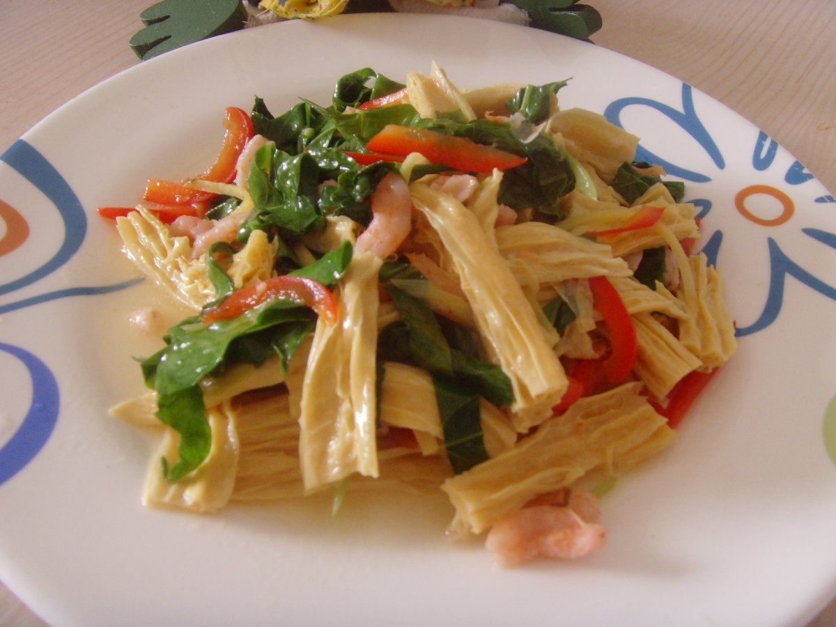 (1)虾皮腐竹:腐竹250克,虾皮20克,蒜头一瓣,麻油、姜、精盐、味精各适量。