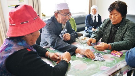 4月3日,在宁夏灵武市郝家桥镇王家嘴社区居家养老服务站,老人在茶余饭后打牌。宁夏灵武市在探索中逐步顺应城市及农村养老服务的实际需求,积极探索构建“9073”养老服务模式,即居家养老占90%、社区养老占7%、老年人机构养老占3%,形成了“集中供养、日间照料、老人用餐、康复健身、文体娱乐” 相结合的养老服务模式。据了解,2009年至今,灵武市共投资260万元,建成城乡社区居家养老服务站17个,设置床位82张。计划在2015年底,通过建设老年公寓、养老院,使养老床位达到1000张,保障城镇社区养老服务实现全覆盖。
