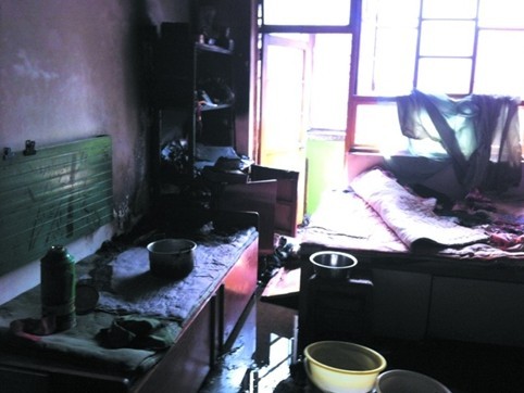 起火的地点位于一栋居民楼的二楼,楼门前堆放着一堆烧坏的被褥。走进屋内,记者看到,大火被扑灭后,屋内一片狼藉。厨房门口摆放的煤气罐被熏黑,煤气罐边上的墙面、椅子、门都被烧坏。地面上满是灰烬。厨房边上的卧室内,一个四层高的柜子被烧坏,床上被褥也烧坏大半,木质的窗框已经被熏黑。屋里放着许多水盆等器皿,地上还残留着灭火之后留下的黑水。