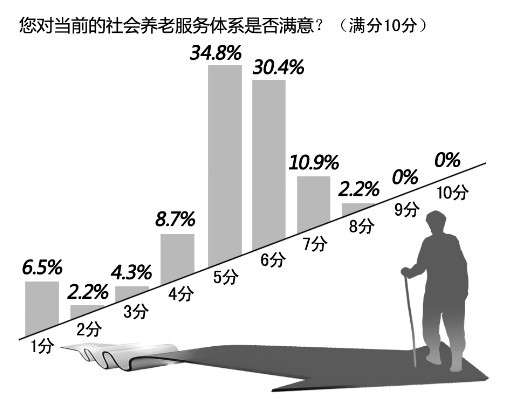 截至昨天16时,56.5%的网友给出了5分及以下的不及格分数。22.2%的投票者认为,养老院太少,不能满足老人需求。26.2%的投票者认为居家养老服务不足,多数“空巢老人”很难享受上门服务。另有18.3%的投票者认为老人经常被迫留在家中。3项合计,66.7%的投票者认为,目前养老体系有待改进,现状的不完善进而导致众多老人因“寂寞”而感到不幸福。