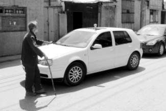 记者看到,这条路很窄,老人走在路中间,根本不避让车辆,看到有司机放慢车速,他便会站到车前,一只手攥着几张一块钱零钱,另一只手不停作揖,如果司机掏出零钱,他会紧贴车身,蹭到车窗处接钱,如果司机一直不掏钱,他就会站在车前不停祈求,僵持时间最多十几秒。