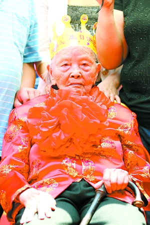 其实,昨天是季明芳老人的百岁寿宴。寿星季明芳老人穿着一件红色外套,坐在阴凉坝下,幺儿何胜华端着一杯菊花茶站在旁边。老人头发花白,一笑,脸上的皱纹更深了。“坐坐坐。”老人连连招手,招呼着身边的客人。