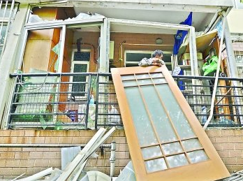 黄家整个厨房一片狼藉,洗手的水池被冲击波整体掀起,紧邻着厨房的北阳台满地都是玻璃渣子,原本埋在水泥中的金属栏杆被炸断,并向外突出了10多厘米。