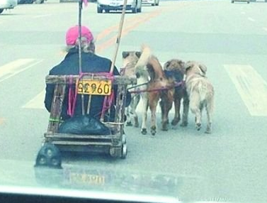 微博飞翔的云jc:新洲,一老者坐在三只小狗拉的、且有车牌的“机动车”上,在快车道上“行驶”,非常危险!