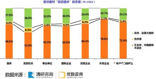 本次调查显示,有68.6%的受访者反对延迟退休。其中,在外资企业工作的人士反对声最高,有78.8%的受访者认为延迟退休不符合中国国情。在党政机关中也有52.8%表示不赞同。