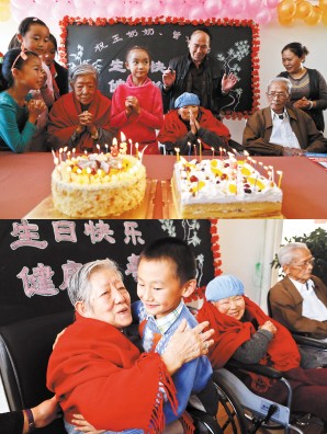 走进昔日简朴的社区居委会办公楼,邻居们发现这里早被布置成了一个温馨的生日Party现场——气球、鲜花、水果、蛋糕、音乐。在大厅里,93岁的王奶奶在老伴和儿子的陪同下坐在布置温馨的会场中,一脸幸福。就在王奶奶的旁边,满头银发的曾奶奶在居委会胡主任的陪同下满眼期待,看得出两位寿星都很开心。来自居委会、社区居民等30多人参加了生日会。