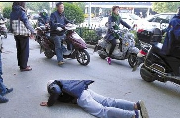 当时正是早高峰,来来往往的行人和车辆很多。看见老人摔倒,有些人径直走开,也有不少人停了下来。可是,停下来的人你看看我,我看看你,谁也不敢上前扶起老人。
