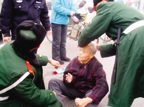 在和平区福安大街一侧,市公安巡特警总队的两名民警和联合值勤的两名武警战士,闻讯后急速赶往老人摔倒的事发现场。过往市民也纷纷围拢上前,有人急忙拿出随身携带的卫生纸递给武警战士,暂时为老人止住了头部流血。