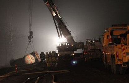 为尽快将槽罐车转移到安全地带,救援人员立即调集两辆大型吊车和一辆拖车来到现场。晚上7点10分左右,交警部门对该路段实施封闭,吊车慢慢地将槽罐车吊到路上。一个多小时后,槽罐车被成功放置到拖车上,在消防官兵的护送下,被送往涡阳县的一化工厂进行处置。