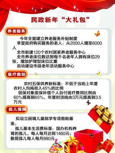昨天,全市民政工作会议传出好消息,今年全市将新建120个农村居家养老服务中心;进一步优化布局,推进第二批社区日间照料中心建设。全市养老床位数达到每千名老年人拥有床位29张,增加护理型床位比重,全市享受政府购买服务的高龄、失能等困难老人由2000人扩大到6000人。