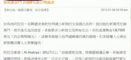 沙特阿拉伯一对夫妇被指贪图约1.7万美元(约合人民币10.6万元)的嫁妆,强迫15岁的女儿嫁给一名90岁的老翁,结果这名女子在新婚之夜将门反锁,两日后便逃回了娘家。