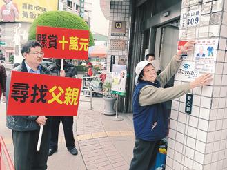 “拜托你们帮我找父亲1蔡泳钦的独子蔡惠民在玉山邮局上班,昨天请假,带着74岁老母亲蔡魏素及读中学请假的侄子,分别拿书写“悬赏10万”、“寻找父亲”标语牌,站在车水马龙的圆环。