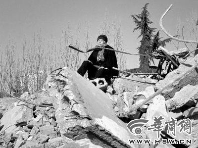 老刘80岁的老母亲坐在房屋的废墟上 图片由记者 李晖摄