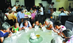 那个中年人,是广东狮子会同德服务队的队长文旭东,而胡婆婆,则是一个普通的退休老师,这个菜馆,如今则是同德服务队的一个服务点,老人们聚集在这里,是来喝德宴楼每天免费提供的养生粥。