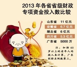 罗东凯介绍,原因主要是财政投入和引导民间资本投入力度不足,远落后于全国平均水平。据民政部统计,2013年,山东省省级财政专项资金投入11亿元、安徽6.7亿元、天津6.3亿元、湖北6亿元、四川5.3亿元,甘肃2.1亿元,投入资金量超过一亿元的省份有14个,而广东省级财政专项资金投入只有5000万,在全国32个省自治区中排名倒数第五,如按60岁以上的老年人均投入来计算,广东则排名倒数第三,与广东的经济地位(2012年广东全年生产总值为57067.9亿元,继续居全国首位)极不相称。