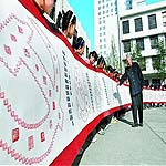 10月31日,为迎接党的十八大召开,安阳六旬老人杨向东展示自己的篆刻长卷《党在我心中》。这幅作品长18米,上面的18个红色党徽都是由篆刻小印“感谢党恩”组合而成。