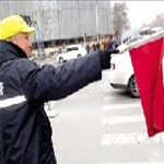 老人制止行人集体闯红灯不仅会逗人开心,而且有特定的目标,他会站在带头“冲刺”的行人前面,一手举旗,一手“开枪”,“如果带头的是一个人,就喊一声‘啪’,两个人喊‘啪’‘啪’”。