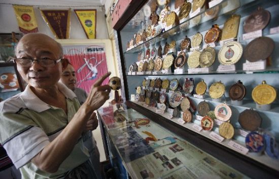 78岁的陈鸿康老人是一位体育收藏迷,他收藏的赛事奖牌、徽章、纪念章、奖杯等共计约1.5万件,其中2000多件与奥运会相关。伦敦奥运会开赛以来,老人每天都会在上海市徐汇区康健街道的家中接待众多参观者,向他们讲述奥运藏品背后的故事。