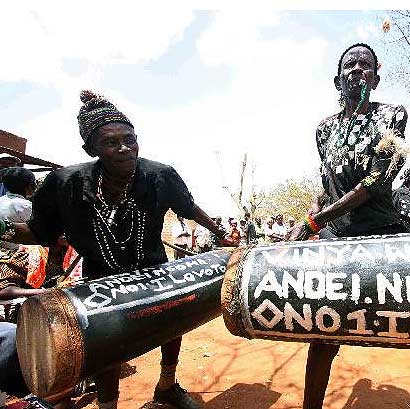 10月15日,78岁的肯尼亚老人穆西约卡带领埃博洛托舞蹈团在集会上进行表演,他身上所背的鼓重8公斤,用当地一种特殊的木材制成。