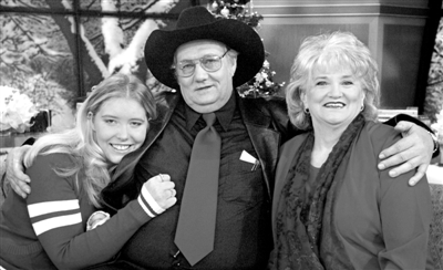 2002年12月的一天,安德鲁·杰克逊·惠特克携妻子和外孙女(左)领取巨额彩票奖金后合影。