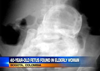 据英国报道,哥伦比亚首都波哥大一名82岁老妪因为腹内疼痛到医院就诊,却意外发现腹中有一个40年前因为宫外孕死亡的胎儿。死胎现在已经完全钙化,变成医学上所谓的“石胎”。