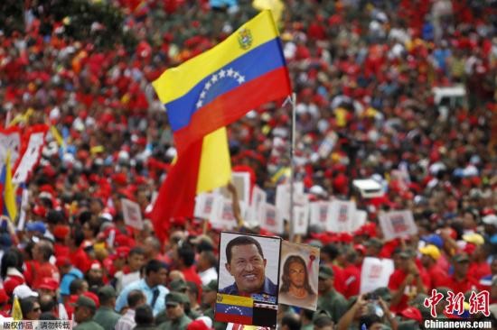 当地时间1月10日,委内瑞拉加拉加斯,在委内瑞拉政府号召下,数千民众聚集在总统府外,为因病不能回国就职的查韦斯举行了另类的就职典礼。支持者挥舞旗帜、举着查韦斯照片,并打出“我是查韦斯”的口号。图为委内瑞拉副总统马杜罗在人群中发表演讲。