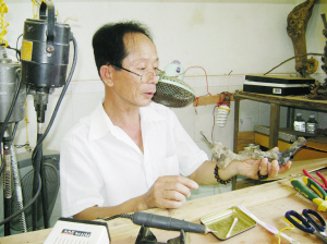 “根雕,七分自然三分雕”,云霄县87岁的老人方启德痴迷根雕艺术40余年,出自他手的作品不计其数。昨日,笔者一走进方启德家,就被众多根雕艺术品吸引,天鹅、孔雀、鸵鸟、母鸡、“鹰与蛇”,鸳鸯、画眉、骏马等作品栩栩如生,让人爱不释手。树根、树桩在老方手中化为形态各异、寓意深长的艺术品。