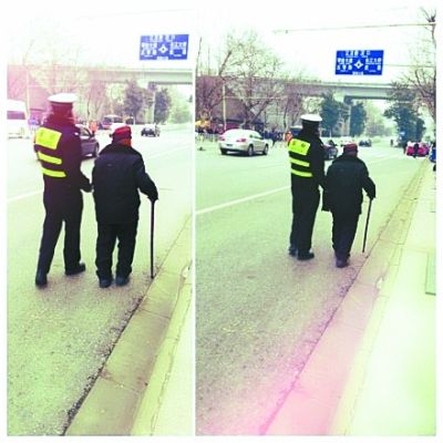 “那一带修路很难走,行人都只能走到马路上和机动车抢道,加上正值周末晚高峰,老人出行更加艰难。这个警察很热心,让人心里感觉温暖”,小李说。