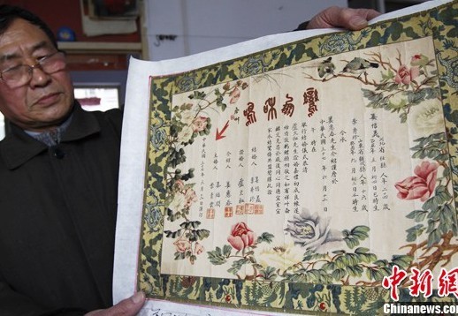3月19日,河南开封证书收藏老人张洪军展示1948年的结婚证,上面印有“鸾凤和鸣”字样,边饰华丽、精致。中新社发 王中举 摄