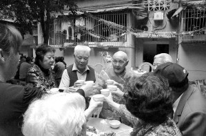 在现场,志愿者、社区工作人员和同院的邻里近200人同举杯,祝福寿星。“大家都来给我过生日,今天很开心。”都大爷不停地向现场来宾表达谢意。“凉拌鸡肉行不,吃点。”“这个汤有营养,喝一碗。”大家忙着给都大爷夹菜、盛汤。“都可以,我不挑食,什么都吃,麻辣的有味的,我更喜欢。”都大爷乐呵呵地说,他就是爱吃,管不住自己的嘴。