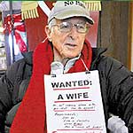 美国俄勒冈州科瓦利斯市82岁老翁桑迪·麦克洛奇单身多年,为了能在晚年找到如意的生活伴侣,竟想出了一个离奇的征婚方法。他像在脖子上挂块牌子到大街上寻求工作的人那样,也在脖子上挂上“征求妻子”的牌子,走上街头征婚。不过到目前为止,麦克洛奇还没有如愿以偿。