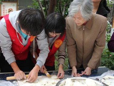 对于在一旁年纪较大的老人,志愿者也和他们聊着家常。黄奶奶是空巢老人,家中子女都在外工作,她告诉记者:"我一个人挺孤单的,这个'邻居节'让我们这些老头老太太聚一起聊聊天也挺好的。今天还有这么多大学生来给我们包饺子,蛮开心的。"