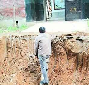 苏东海的老伴说,10月17日他们老俩出去了,下午回来时发现家门口挖了一条大沟,两人沿着坑边缘回到了家。谁知第二天一大早,这条沟又“变大”了,足足有两米深,已经不能过人了。