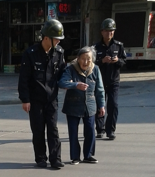 原来,10月27日下午2时,梧桐保安队城东一班巡逻队员沈广和俞勤强在班长金建华的带领下开展巡逻工作。当他们走到茅盾路与金波路交叉口附近时,发现一名年纪很大的老太太坐在地上。他们立即上前询问,得知老太太是本地人,今年92岁,家就住在附近的凤鸣小区,老人一个人出来散散步,没想到一时糊涂迷了路,不知道怎么回家。金建华和老太太攀谈后,决定送老人回家。就这样,金建华在前面带路,沈广和俞勤强两人搀扶老太太过马路。没想到这温馨的一幕被过路群众用手机拍下,最后辗转发到了派出所所长的手机上。