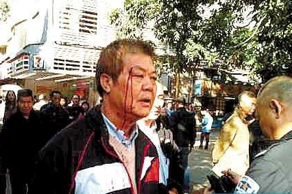 新快报记者从一位目击者拍摄的照片看到,苏伯右边眼角破裂,血顺着脸颊流到脖子上,衣领和外套也沾了血迹。苏伯随后被送到医院,眼角缝了两针。
