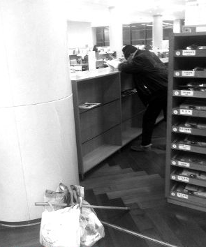 “我刚打完水,看到有个老人走进报刊阅览室,他右手拿着一杯85度C的咖啡,我很喜欢他们家的咖啡,看见‘同类’总要多注意几眼,正在疑惑上了年纪的人都不喜欢咖啡的,我注意到老人左肩扛着一根1米长的竹竿,竹竿上挂着三四个塑料袋,其中一袋装的塑料瓶都快满出来了。”桂小姐仔细琢磨老人的打扮,她走上前看到老人咖啡杯里没有咖啡是热开水,“他可能是位拾荒老人,杯子可能是他刚捡来的。”