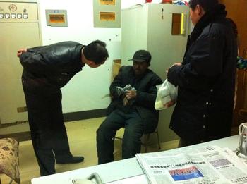 老人衣着单薄浑身发抖,民警脱下大衣给老人盖上,又从村民家里找来被子给老人裹上。过了半个多小时,老人有些清醒,聊天得知,他今年60多岁,常年在外流浪乞讨为生。这几天降温,很难讨到吃喝,两三天没吃上东西,走到刘楼村时,体力不支晕倒在路边。