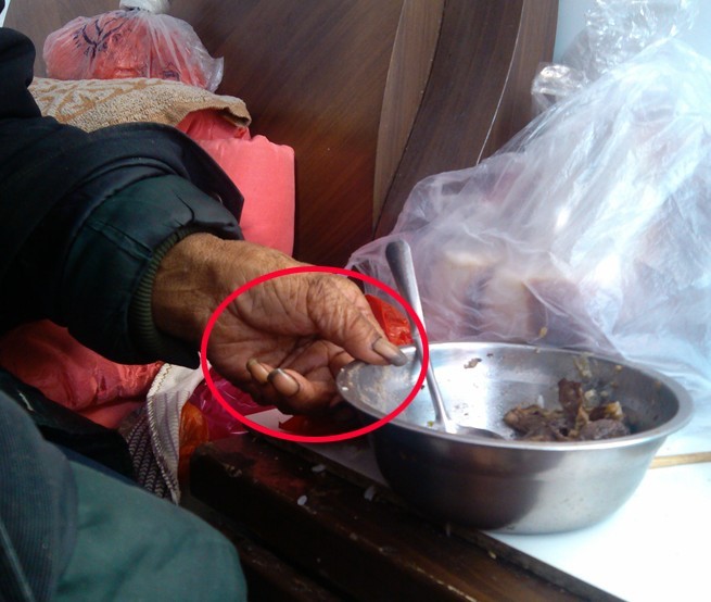 记者上前与吃饭的老人聊起来,“吃的什么呀?伙食怎么样啊?”,“过年吃的还行。”记者看到其中一位老人的手指甲又长又黑,应该是许久没有剪指甲了,老人身上爬满米粒大的虱子,床单也很脏,老人面目暗黑,胡子很长,像是很长时间没洗脸剪胡子了。