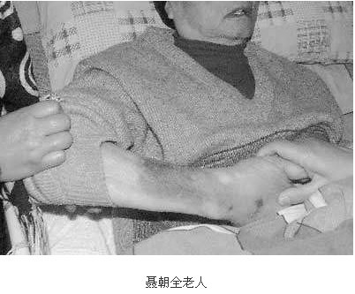 昨日下午,记者来到成都市慢性病医院。在病房中,记者见到了聂朝全老人,他躺在床上一直呻吟。同病房里的其他三位老人双手也都被捆在了铁床架子上。