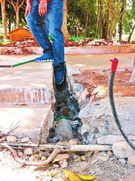 记者看见一条长一两米的沟横在桃源广场人行道上,沟深30厘米左右,宽仅15厘米,难怪朱大妈脚踩进沟里出不来。在广场上休闲的一些老人告诉记者,近日,工人为了亮化工程进行施工。但现场不见施工人员,朱大妈找不到责任方,先是回家自己拿酒精清理伤口,很快又被儿子张先生带去省红会医院包扎伤口。张先生担心其他市民再次摔伤,希望通过本报提醒施工人员和过路市民。