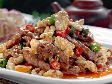 牛肉片180克,山药片250克,鲜核桃仁60克,红椒片40克