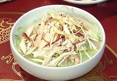 2、将火腿丝冬菇丝连同清汤倒入锅中,加盐、胡椒粉旺火烧至汤沸后,冲入装鸡丝的汤碗内即可。