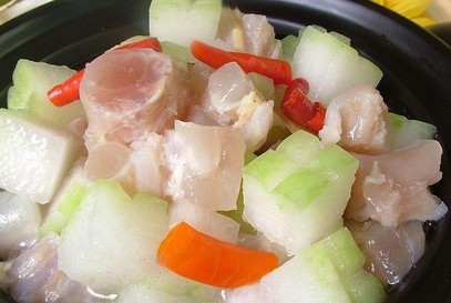 3、补肌,益髓,养颜:取冬瓜1000克,水蟹2只,猪排骨400克,蜜枣3个,生姜3片。先将冬瓜洗净,连皮切成厚块;水蟹宰洗净;猪排骨洗净切块;蜜枣洗净,稍浸泡;然后与生姜一起放进瓦煲内,加入清水3000毫升,武火煮沸后,改用文火煲2.5小时,调入适量食盐及生油,即可食用。