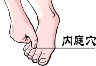 内庭穴是在第二足趾和第三足趾之间的缝隙交叉处,每天早晚用大拇指点揉100次即可。