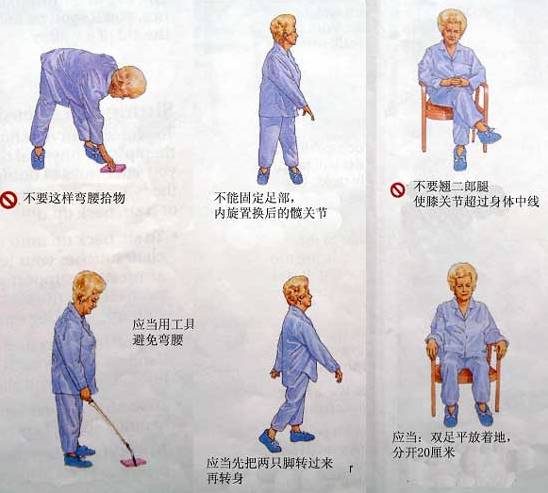 (1)坐位:术后第一个月内坐的时间不宜过长,以免导致髋关节水肿,亦可用冷敷及抬高患肢来改善,保持膝关节低于或等于髋部,不宜坐过低的椅子、沙发,不要交叉腿和踝,前弯身不要超过90度,坐时身体向后靠腿向前伸。(2)入厕:用加高的自制坐便器入厕,或在辅助下身体后倾患腿前伸入厕,注意保持膝关节高于髋部。 (3)取物:术后2周内不要弯腰捡地上的东西,不要突然转身或伸手去取身后的物品,吃饭时宜把饭碗放在面前。 (4)乘车:臀部位置向前坐,身体向后靠,腿尽量前伸。 (5)淋浴:伤口愈合后,辅持可靠可进行淋浴,因站着淋浴有一定的危险,故可坐一个高凳子,喷头为可移动的手持喷头,并准备一个带长柄的沐浴海绵以便能触到下肢和足。 (6)穿脱鞋袜:请别人帮忙或使用鞋拔子,选择不系带的松紧鞋、宽松裤,行后外侧切口者可内侧提鞋,行前内侧切口者可外侧提鞋。 (7)完全康复后可进行的体育活动:散步、园艺、骑车、保龄球、兵乓球、游泳、跳舞,并保持适当的体重。避免进行对新髋关节产生过度压力造成磨损的活动,如跳跃、快跑、滑雪、滑水、网球等。