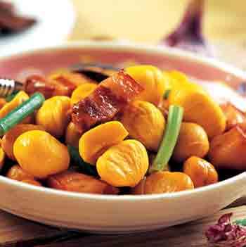 板栗烧猪肉:取板栗250克,瘦猪肉500克、盐、姜、豆豉各少许,将板栗去皮,猪肉切块,加盐等调料,加水适量红烧,熟烂即可。